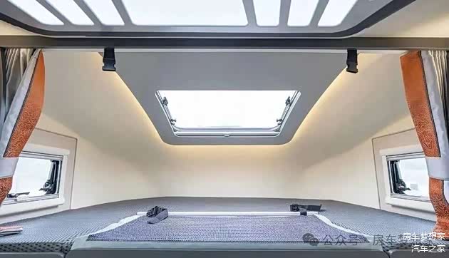 额头床区域配置了一个超大面积的弧形曲面天窗,加上两侧的通风窗,确保了良好的自然采光和空气流通。这个空间足以舒适容纳一家三口休憩。