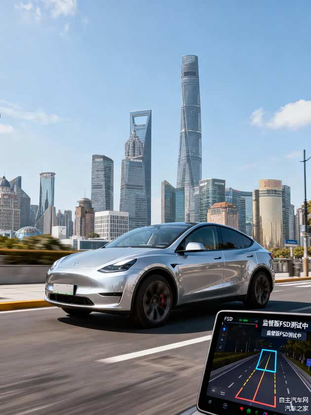 (配图:特斯拉Model Y行驶在上海陆家嘴CBD的动态图,中控屏亮着FSD界面,标注“监督版FSD测试中”)