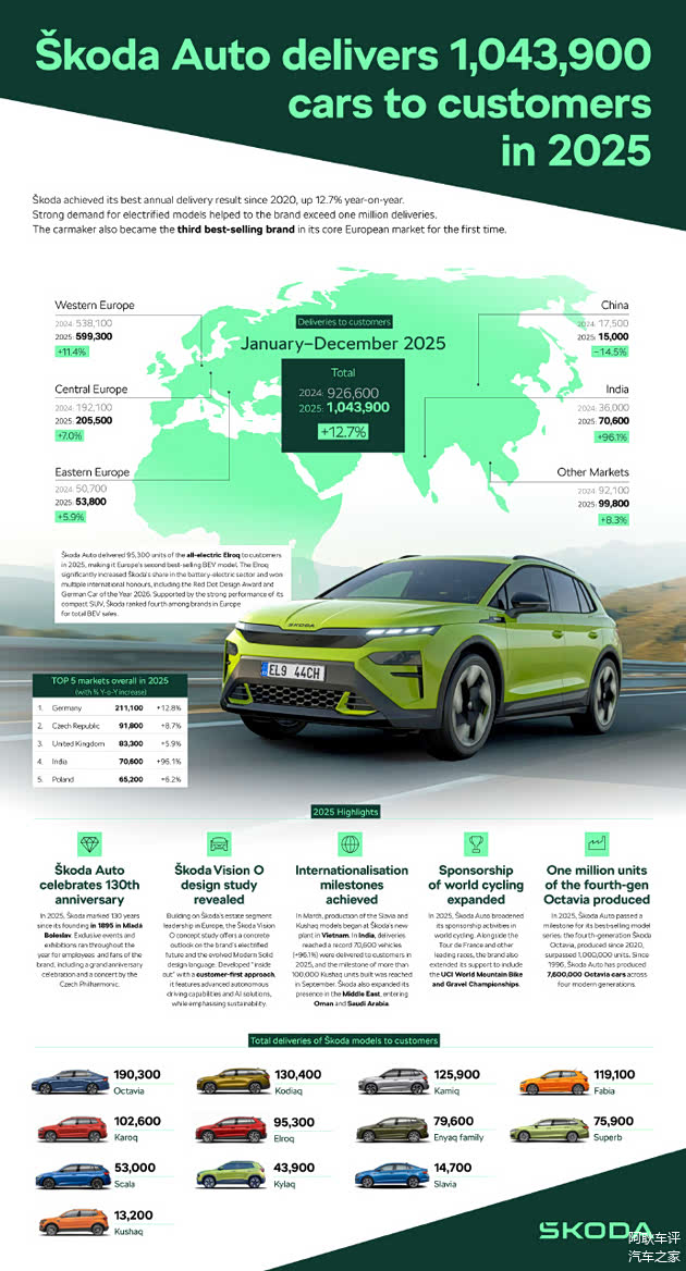 德国是其全球最大单一市场,销量达21.11万辆,同比增长12.8%。在其本土捷克市场,销量为9.18万辆。