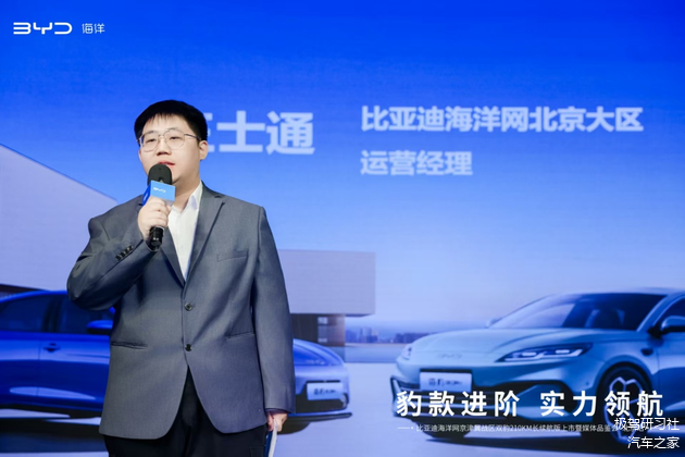 活动开场,比亚迪海洋网北京大区运营经理王士通先生登台致辞。他重点阐述了推出210km纯电续航版的核心目的:为用户带来高价值体验,持续兑现承诺,就是要让“低成本、零焦虑”的绿色出行覆盖更广泛的生活场景。随着城市生活半径扩大和用户需求升级,传统纯电续航已难以满足消费者期待。210km的纯电续航能力,意味着大部分用户可以实现“一周一充”,日常通勤完全无需燃油。