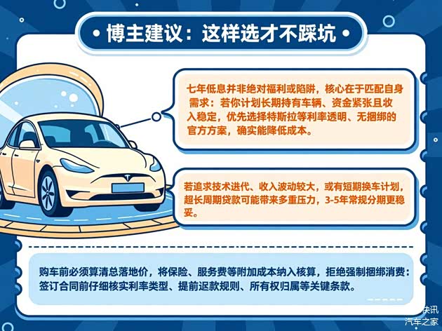 七年低息并非绝对的福利或陷阱,核心在于匹配自身需求。若你计划长期持有车辆、资金紧张且收入稳定,优先选择特斯拉等利率透明、无捆绑的官方方案,确实能降低成本;若追求技术迭代、收入波动较大,或有短期换车计划,超长周期贷款可能带来多重压力,3-5年常规分期更稳妥。