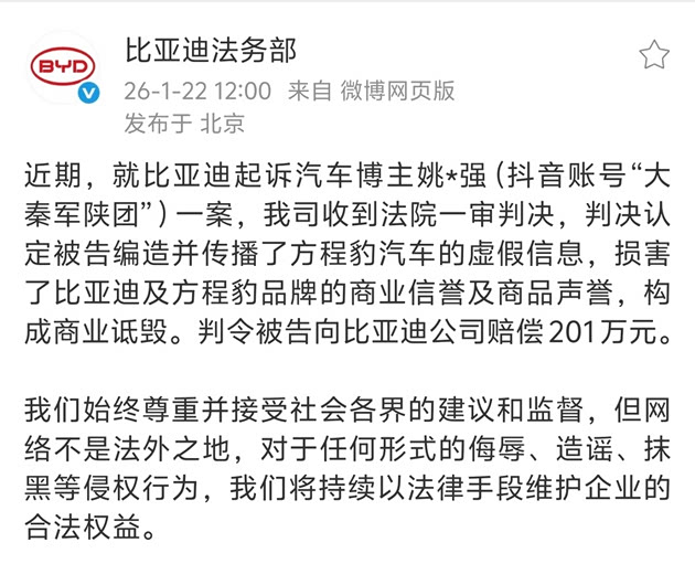 经过近8个月的审理,2026年1月22日,法院一审判决认定,被告编造并传播了关于方程豹汽车的虚假信息,损害了比亚迪及方程豹品牌的商业信誉和商品声誉,构成商业诋毁,判令其向比亚迪公司赔偿201万元。