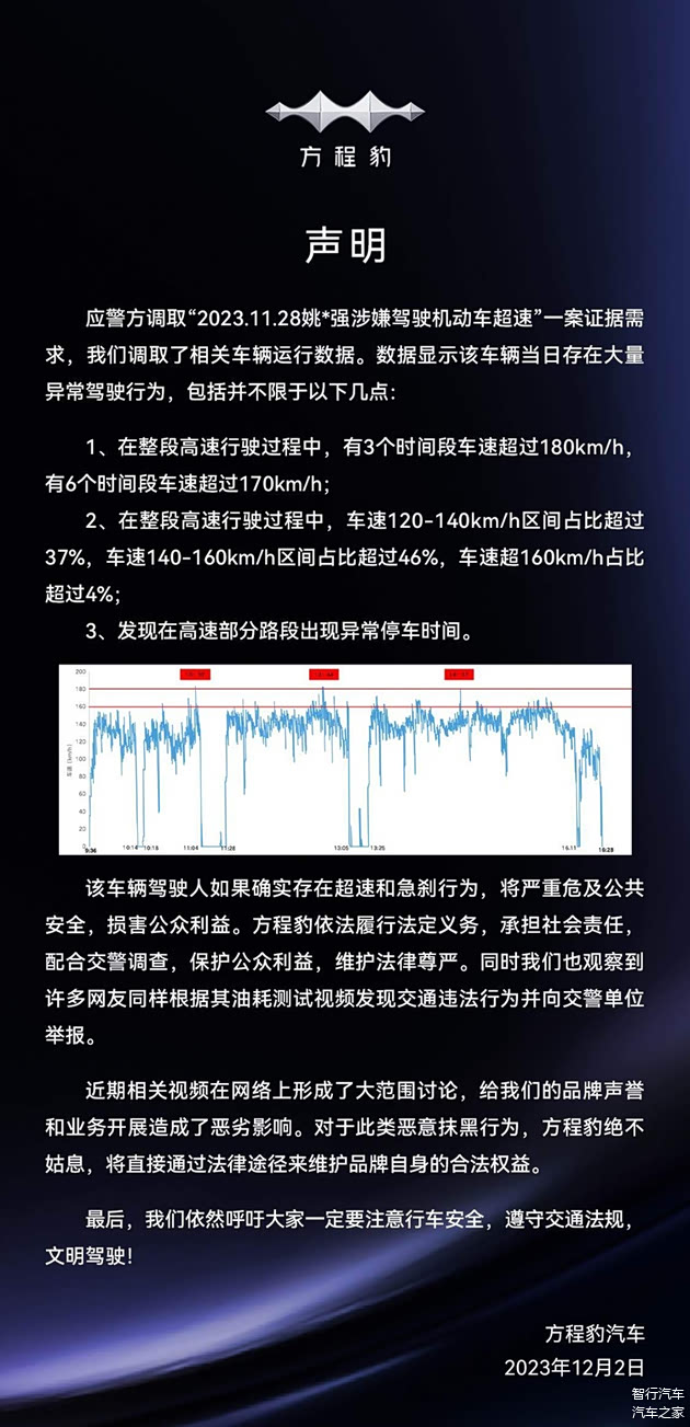 事后,比亚迪官方公布了后台数据,测试车辆在当日存在大量异常驾驶行为:有3个时间段车速超过180km/h,6个时间段超过170km/h,120-140km/h区间占比超过37%,140-160km/h区间占比超过46%。