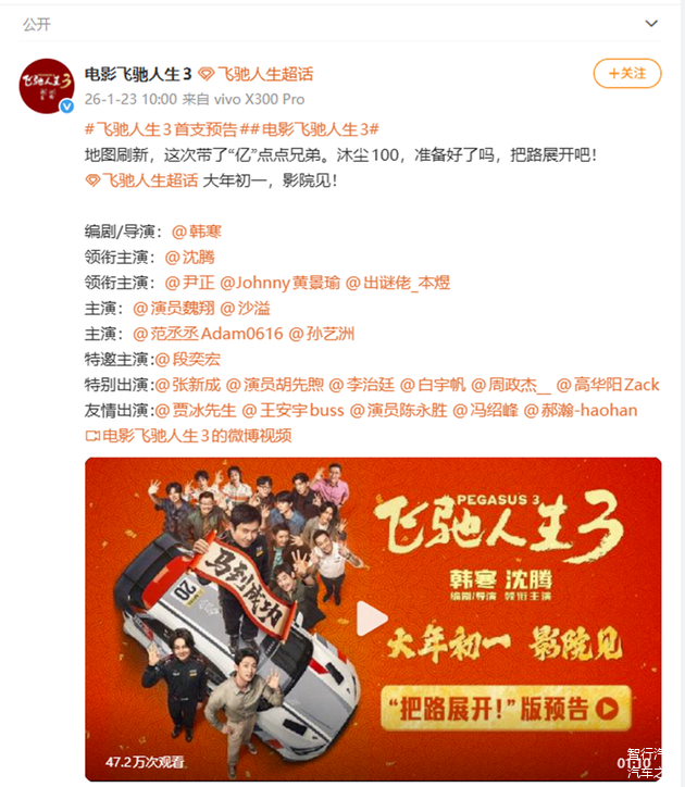 要说2026年春节档最期待哪部电影,那车迷朋友期待的应该就是韩寒的《飞驰人生3》了。随着上映日期的临近,网上也流传出了相关的剧照,特别是关于剧中车辆的照片。咱们就来看看,爱车如命的韩寒,这次都搞来了哪些宝贝赛车。