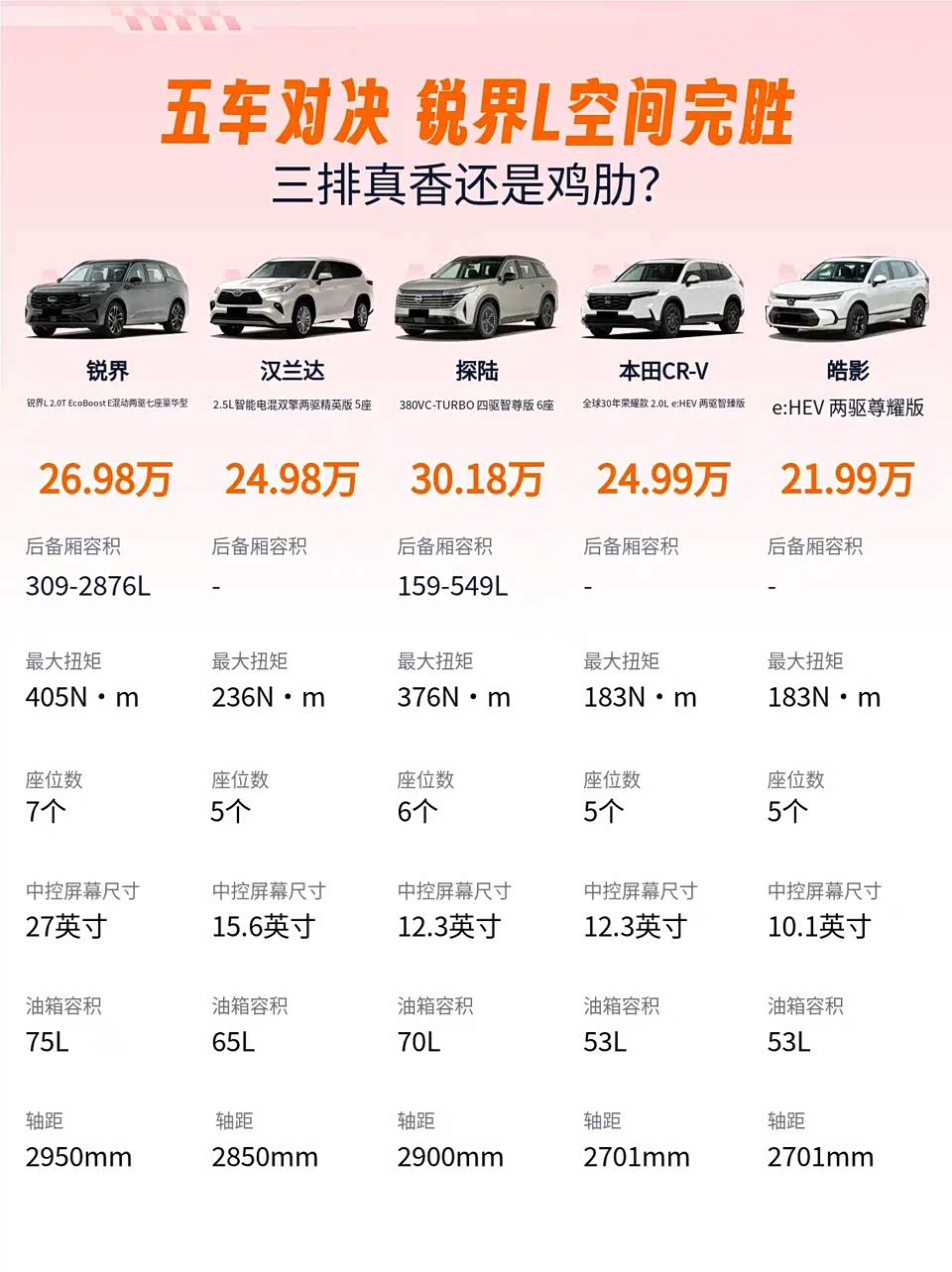 结果上周自驾游,五车家庭团直接让我当领队——汉兰达第三排挤成“折叠椅”,探陆后备箱塞不下烧烤架,CR-V和皓影混动爬坡集体喘粗气…