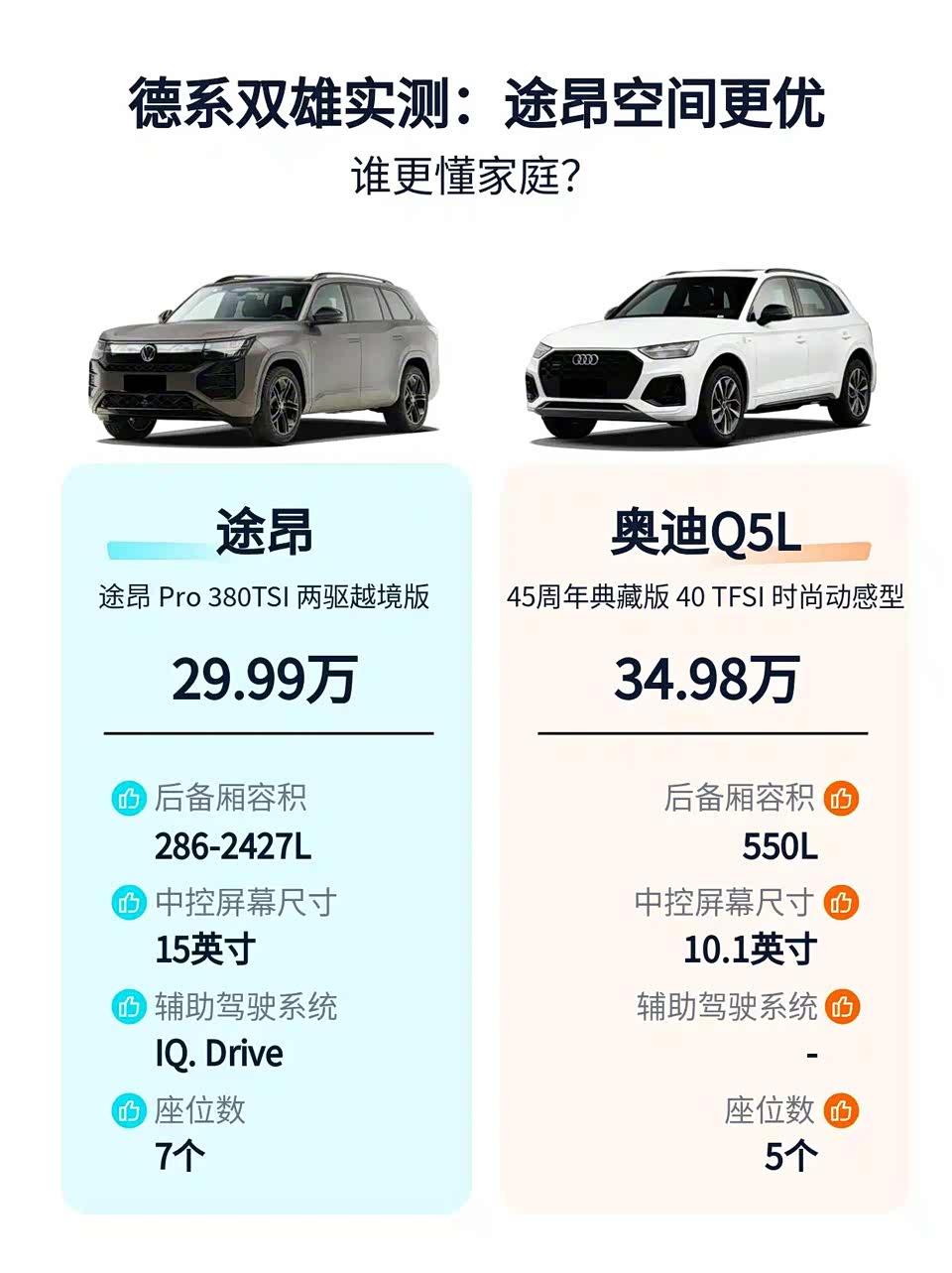 3️⃣ 性价比暴击:途昂29.99万配座椅通风/加热,Q5L同价位连360影像都要加钱