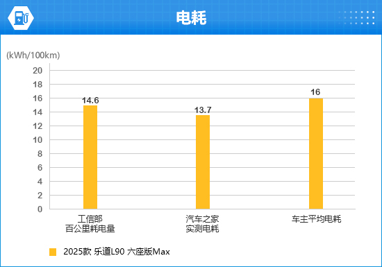 通过收集工信部申报信息、各大汽车垂直媒体测试和车主实测的数据来看,2025款乐道L90六座版Max的工信部百公里耗电量为14.6kWh/100km,汽车之家实测电耗为13.7kWh/100km,车主平均电耗为16kWh/100km(数据仅供参考)。