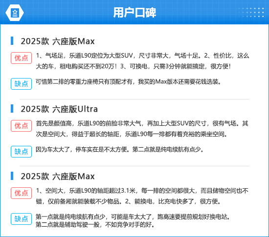 在用户口碑中,多数消费者对2025款乐道L90的设计、空间以及性价比等方面表示满意,不过有部分消费者反映其存在纯电续航里程偏短等缺点。