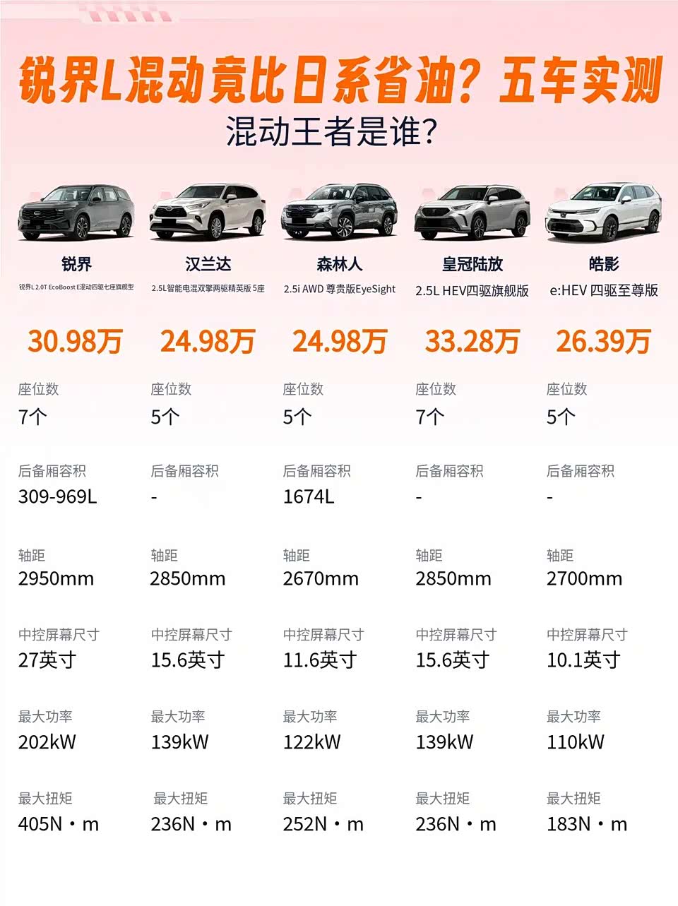 谁说七座SUV第三排只能坐狗?🚗五车实测告诉你真相!二胎奶爸们看过来,90%人买车后才后悔座椅布局选错! 锐界L的223二排独立座椅+309L后备箱✅ 👉实测二排过道宽25cm,抱娃进出不卡腿 👉三排坐垫加厚5cm,长途不硌屁股 汉兰达五座版后备箱680L但没七座❌ 皇冠陆放三排膝部仅25cm,成人得蜷着⚠️ 皓影魔术座椅灵活,但全系五座硬伤… 森林人后备箱1674L,可惜只有五座❗ 最绝的是锐界L二排带通风加热,混动油耗才6.8L!全家出游时老婆再也不用喊腰疼了👶 所以问题来了:30万预算你会选「灵活大空间」的锐界L,还是「保值省油」的汉兰达?