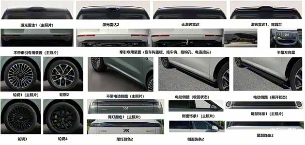 从此前的申报信息来看,根据车型配置不同,会提供拖车钩、电动踏板、半幅方向盘以及四种不同样式的轮毂选择,中高配车型带有激光雷达,支持高阶智能驾驶辅助。