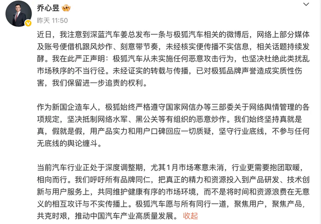 1月24日,北汽蓝谷新能源科技股份有限公司用户运营中心副总经理乔心昱通过官方渠道发布声明,针对近期网络上流传的极狐汽车涉及恶意攻击行为的讨论进行回应。声明明确表示:“极狐汽车未实施任何扰乱市场秩序的行为,同时指出未经证实的信息传播已经对品牌声誉产生实质影响,企业将保留追责权利”。此举在一定程度上反映了品牌在面对舆论环境变化时的态度,即重视事实澄清与法律维权,同时强调信息传播应以真实为前提。