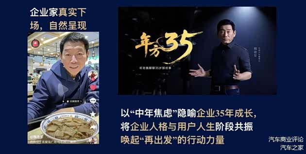 所以在金轩案例里,这几年很多汽车企业的董事长、创始人和高管都下场了,企业家真实的下场,这种自然的呈现和吸引人。大家可能很多人都刷到了长城汽车魏建军吃面的视频,长城汽车在35年的时候还为中年焦虑做了一个很好的引喻,唤起再出发的力量,魏总来给35岁的打工人缓解职场焦虑,我想这样的内容是非常具有丰富的人格化的表达的。