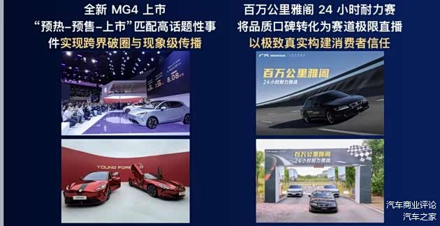 不管是极石上市之后重走丝绸之路,还是享界S9T告别“发布会即高潮”,多次和用户场景做沟通;或者是华为的乾崑和广汽启境的上市,从品牌产品渠道集中做整合营销;或者铂智3X上市,后续娱乐化、场景化的体验,包括全新MG4的上市跨界营销,以及包括雅阁百万公里24小时耐力赛,实际上都是在告诉我们,今天上市只是一个和用户关系的开始。