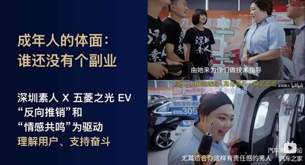 我们还看到五菱之光 EV,用反向推销的方式来讲成年人的体面,谁还没有一个副业,从而展示出理解用户,支持大家奋斗的品牌精神。