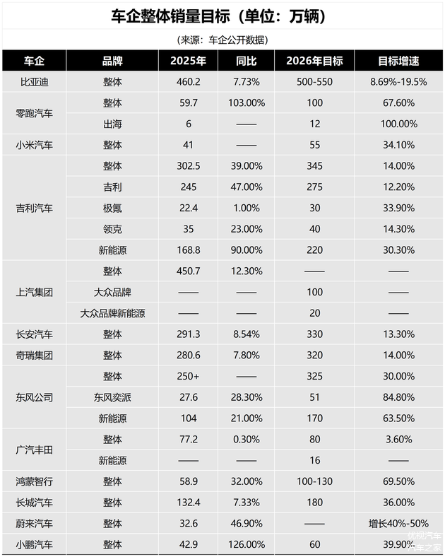 但从目前各家车企已透露的2026年销量目标来看,都比较激进。这些车企的销量目标,同比增长30%以上的不在少数,它们的销量之和已经接近国内市场的容量。
