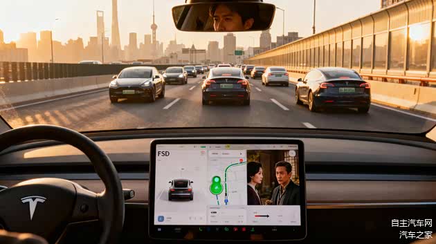 (配图:特斯拉Model 3行驶在上海延安路高架的FSD界面示意图,屏幕上显示编队行驶路线、绿灯倒计时和周边车辆状态)