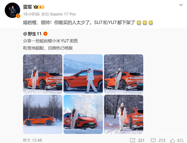 1月25日,小米创始人雷军今日转发了一位博主发布的关于小米汽车熔岩橙配色的博文,并配文“欢迎更多熔岩橙车主晒照片”。日前,另一位汽车博主分享的熔岩橙 小米YU7美图引发关注,雷军转发并连发三个泪目表情。表示该经典配色因敢买的人太少,SU7和YU7均已下架,言语间满是不舍。