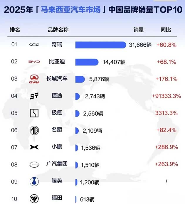 2025年,奇瑞在马来西亚卖了3.2万辆,同比增长60.8%