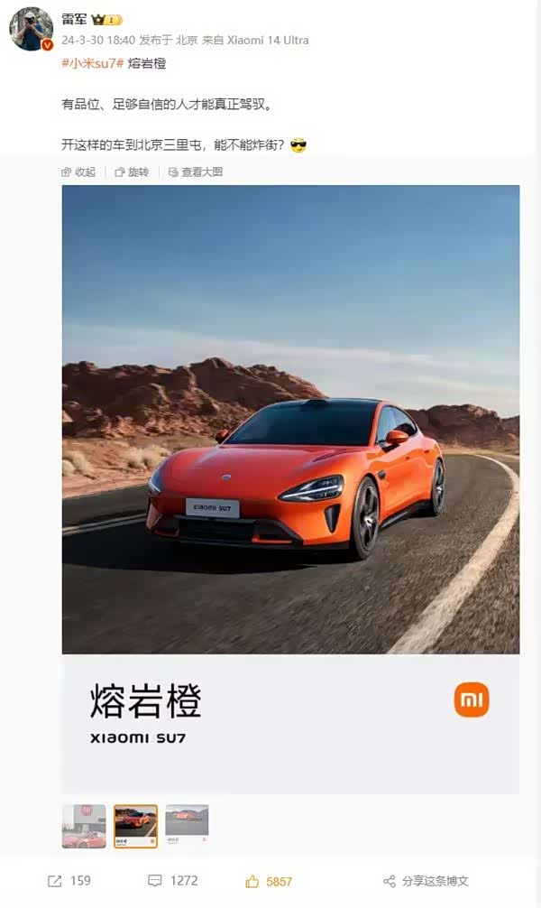小米最具代表性的颜色下架了,绝版了! 估计熔岩橙二手车得涨价一波儿了……感觉这和文化有关系,国内消费者普遍都是黑白灰,除了超跑和那种纯玩乐属性的车,都不愿意选择太扎眼的,文化偏向内敛低调保守,成年人对稳重成熟有一种天然的信任感,其实选择一个炸眼的颜色也不代表这个人就不成熟稳重,但是我们普遍的文化赋予人的感觉就是骚和稳重不共戴天,所以导致非主流颜色的二手车保值率普遍比同款车型的黑白色更低……但是这对小米这种新势力来说就是必经之路,在和汽车市场消费者打交道的过程中会逐渐更懂用户和市场。