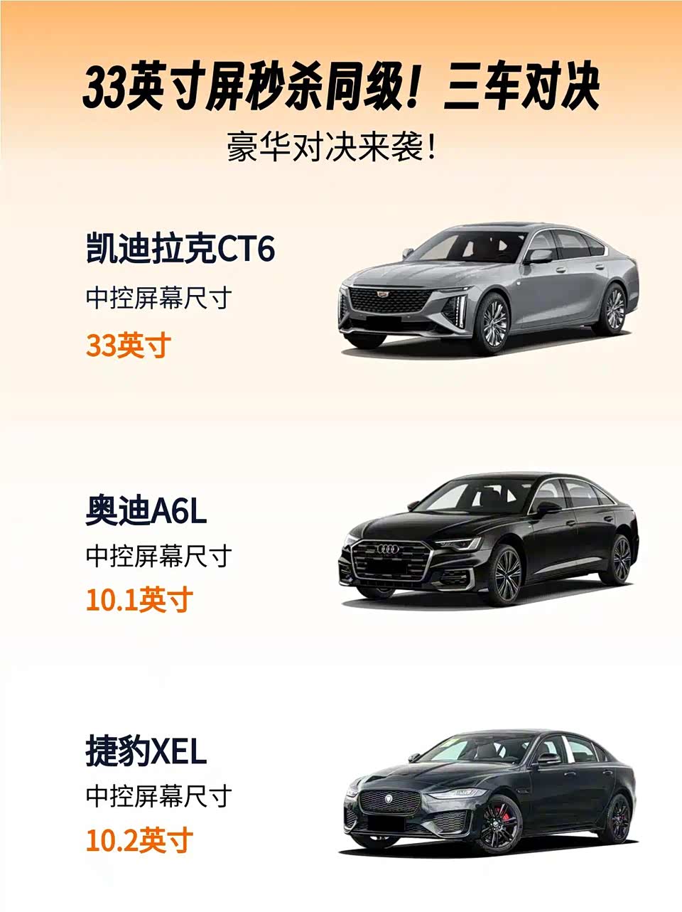 凯迪拉克CT6的33英寸9K巨屏(271PPI)直接碾压奥迪A6L的10.1英寸双屏和捷豹XEL的10.2英寸屏,8155芯片操作跟手度完胜!夜视系统探测80米,A6L要选装,XEL连倒车影像都延迟…