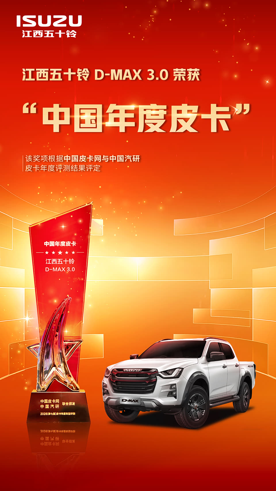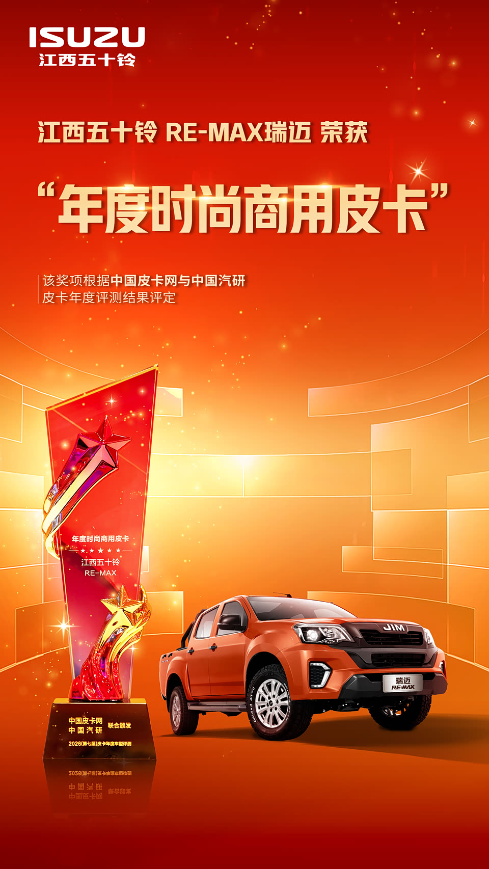 双星登榜,实力加冕! 2026年度权威皮卡评测结果重磅发布: #D-MAX3.0 问鼎巅峰,荣膺“中国年度皮卡”最高荣誉! #RE-MAX瑞迈 引领风潮,斩获“年度时尚商用皮卡”大奖! #江西五十铃