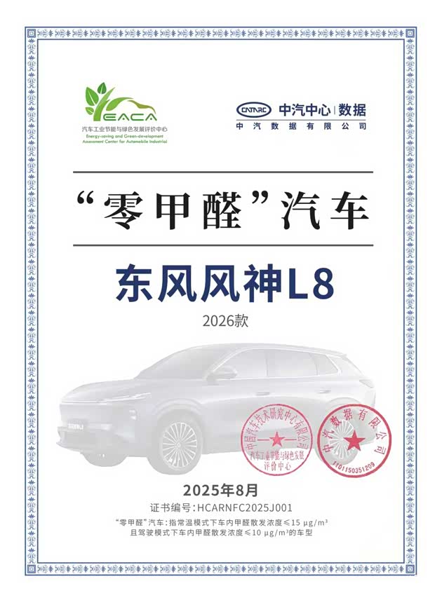 我们都知道,座椅是家人出行最亲密的陪伴,舒适度与安全性更是家庭用户的心头事。东风风神L8的座椅不仅拿下“座椅舒适之星”认证,更有“零甲醛汽车”双权威背书,环保无异味,无论是对环境敏感的婴儿还是呼吸道脆弱的老人都能安心乘坐。