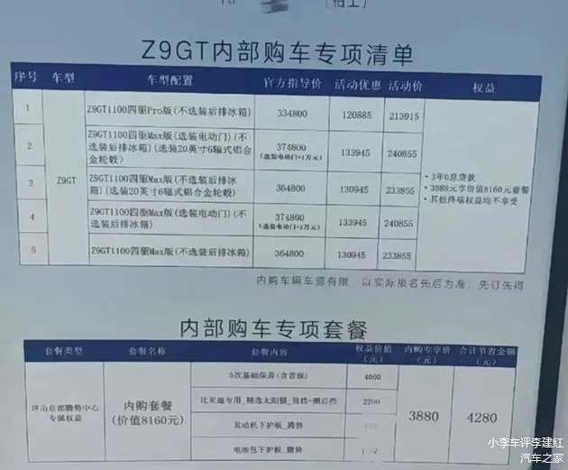 日前,网上曝光了一组了比亚迪员工购买 腾势Z9GT的内部价格表,原本33.48—36.48万元的腾势Z9GT,比亚迪给出了21.39—23.39万元的员工折扣价,最高优惠达到了13.4万元。因为小编我对腾势Z9GT这款车非常喜爱,所以对这款车的市场行情也比较关注,所以我们可以非常笃定地说,腾势Z9GT这波内部价,外面肯定是没有的,不是内部员工,是无法享受到这么大的折扣的。