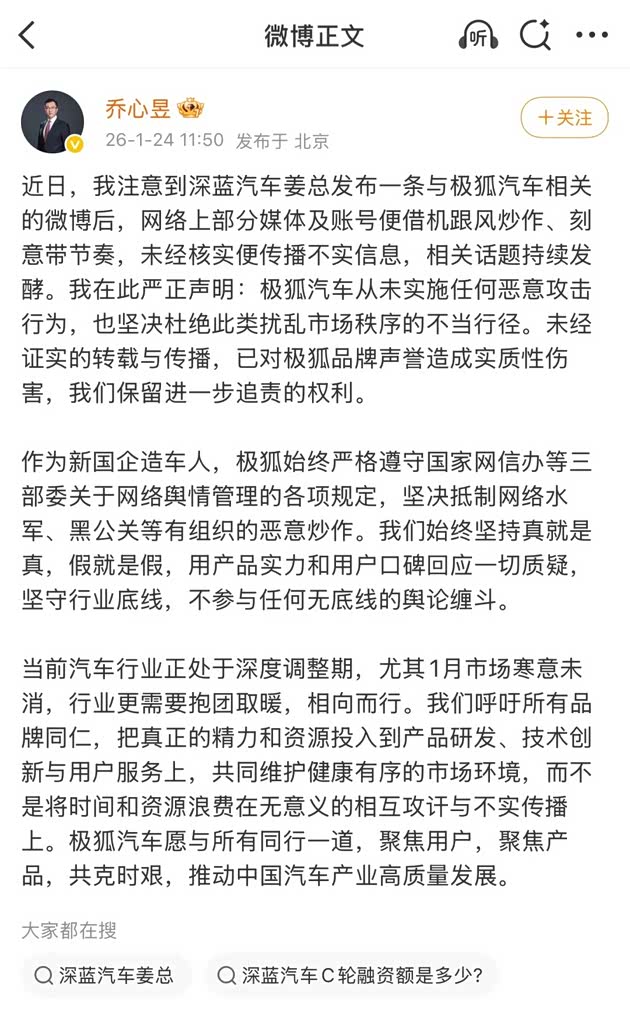 1月24日,北汽新能源极狐品牌用户运营中心副总经理乔心昱针对该事件发文称:近日,其注意到深蓝汽车姜总发布一条与极狐汽车相关的微博后,网络上部分媒体及账号便借机跟风炒作、刻意带节奏,未经核实便传播不实信息,相关话题持续发酵。