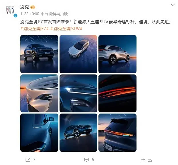 1月22日,别克官方微博公布了至境E7的官方图片,并将其定位为新能源大五座SUV在豪华舒适领域的标杆。