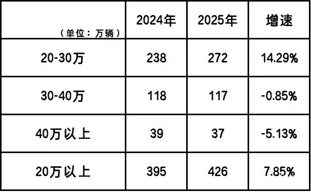 2025年20万以上新能源市场累计销量仅426万辆,同比增速仅7.8%。在新能源乘用车大盘同比增长17.6%的情况下,这只能算“微增”;新能源乘用车持续下探的均价——从2023年的18.4万元,到2024年的18.0万元,再到2025年的16.1万元——似乎也验证了新能源市场的消费结构正在不断下沉的事实。