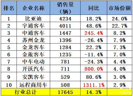 中通客车累计出口1447辆,同比大增245.4%(增速第三),市场份额8.2%,稳居行业第三;中车电动以781辆的累计出口销量成绩跃升行业第七,市场份额为4.4%。