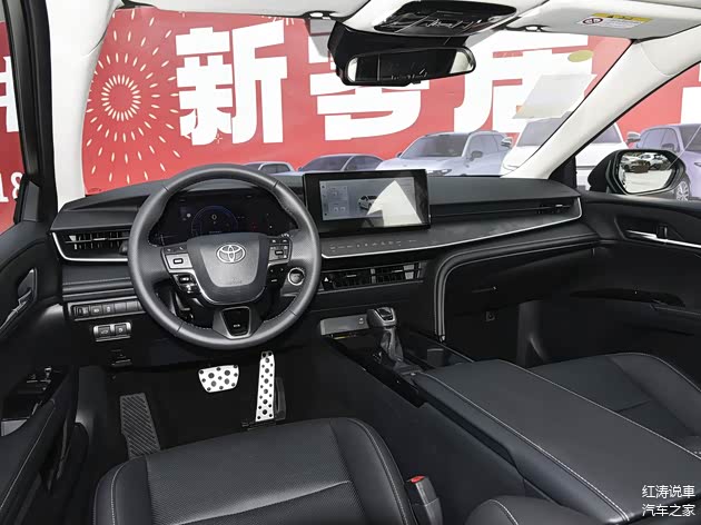 内饰方面,2026款丰田凯美瑞双擎HSE光辉版的中控台布局没有变化,采用星空黑配色,配备真皮多功能方向盘、前排15瓦手机无线充电、7英寸液晶仪表、10.25英寸中控屏,支持CarPlay、CarLife、HUAWEI HiCar手机互联和映射,但是车机不支持联网、OTA升级、语音识别控制等,功能比较少。
