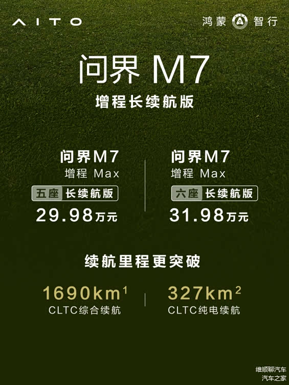 为满足用户多元化的需求,问界近期推出了全新问界M7增程长续航版,提供五座与六座版本,售价分别为29.98万元与31.98万元。新版车型采用高效的后驱模式,后电机最大功率达227kW,在CLTC标准下实现了327km的纯电续航与惊人的1690km综合续航里程。这意味着日常通勤可完全用电,经济环保;长途远行则毫无里程焦虑,尽享增程无忧的便利。