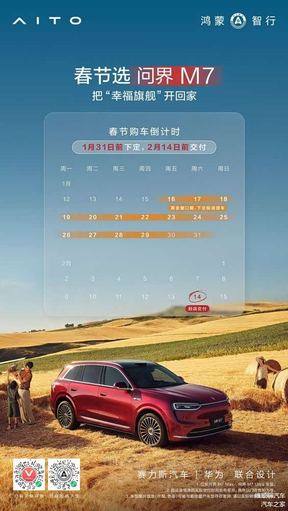 春节的钟声即将敲响,别让等待延误了团圆的喜悦。现在就行动起来,亲临问界线下门店,体验全新问界M7带来的非凡魅力并完成下定。锁定快速交付通道,叠加超值限时权益,这个春节,让全新的智慧出行体验,成为您家庭幸福故事的美好开篇。