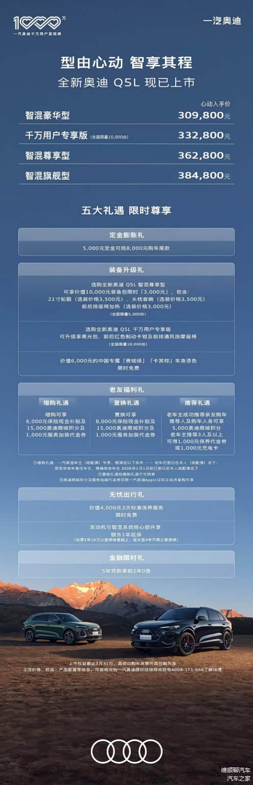 一汽奥迪销售有限责任公司执行副总经理郭永锋表示,未来品牌将持续"以用户为中心",全面升级战略部署,致力于实现"品牌发展领先、商品技术领先、客户体验领先、生态责任领先"的四大目标。全新奥迪Q5L作为千万里程碑后的首款重磅车型,承载着品牌的期望与用户的信赖,它将以全维进化的产品实力、全场景的权益生态、有温度的服务体验,续写豪华品牌的新传奇,与千万用户共赴更美好的出行新征程。