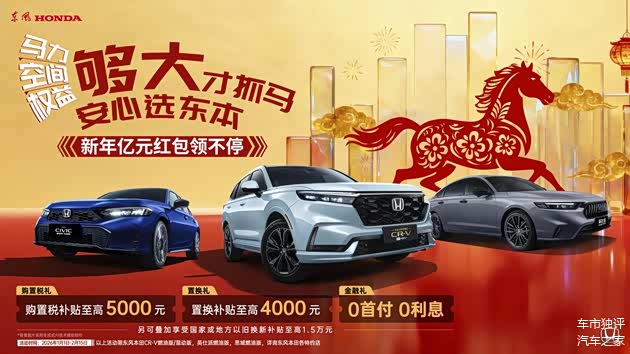2026年1月1日,东风本田发布了“安心选东本,新年亿元红包领不停”的优惠活动,截止2月15日前,购车用户可享受多重好礼。与此同时,2026年中国车谷品牌运营中心汽车消费券活动也同步启动。这意味着,购买东风本田旗下的部分车型,即可享受到品牌新春钜惠,与地方政策补贴的双重礼遇。