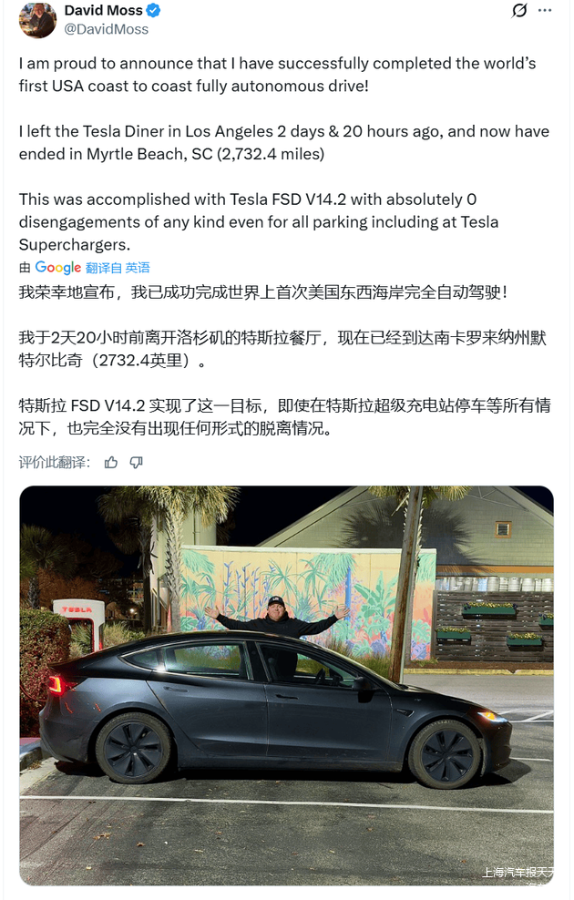 当大多数车企仍在围绕“城市NOA覆盖率”“高速辅助是否足够稳定”展开竞争时,特斯拉车主的一次横跨美国的FSD测试,把自动驾驶的讨论拉进了新的语境。