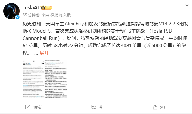 1月26日消息,特斯拉官方微博今日发文宣布,美国车主Alex Roy和朋友驾驶搭载特斯拉智能辅助驾驶V14.2.2.3的 特斯拉Model S,首次完成从洛杉矶到纽约的零干预“飞车挑战”(Tesla FSD Cannonball Run)。