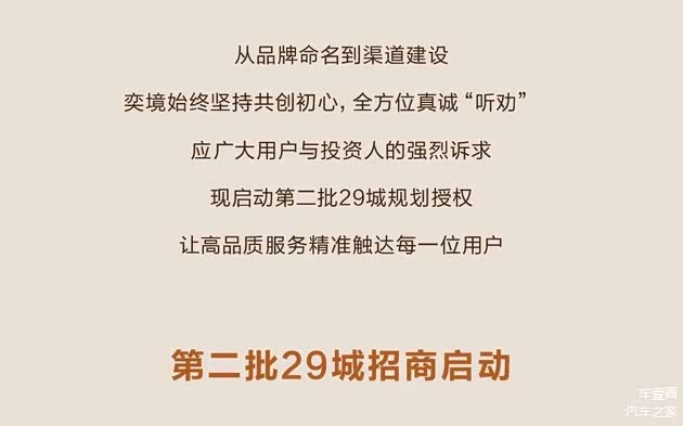 就在新车冬测伪装图曝光次日,品牌方又有新“动作”。奕境汽车对外宣布:已启动第二批共29城之招商。据悉,自该品牌首批50城招商启幕以来,共有超过200家投资主体报名,其渠道建设亦迎来快速增长,并覆盖了2025年国内新能源汽车销量排行前十之城市。