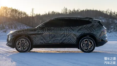 来到车身侧面,传统的SUV轮廓,不过C柱和D柱之间玻璃面积较小,侧面的线条更为锋利,营造出肌肉感,车顶较为平直,细节上,一条黑色饰条从前大灯组延伸至前车门位置,新车采用无框车门、隐藏式门把手、车顶行李架、21英寸金色轮圈搭配金色卡钳,很精致,新车采用三种铝合金轮圈选择。车身尺寸方面,新车的长宽高分别为5000/1954/1688mm,轴距3030mm。