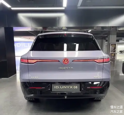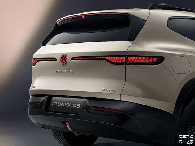 车身尾部,简洁的设计风格,中央带有可发光红色大众尾标,下侧为“ID.UNYX”金色标识。值得注意的是,新车的后扰流板内部的高位刹车灯,灵感源自沃尔夫斯堡的“狼标”。