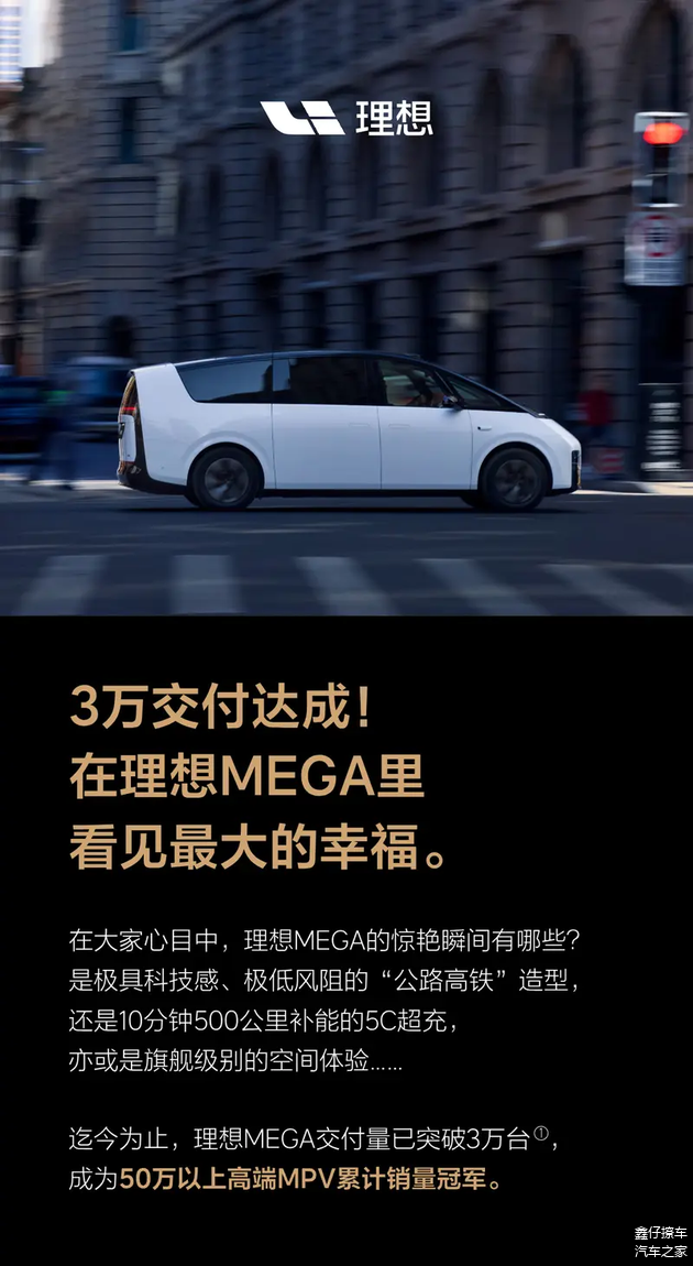1月26日,理想汽车官方宣布 理想MEGA达成30000台交付,并登上50万以上高端MPV累计销量冠军宝座。新车共推出2款车型,售价52.98-55.98万元。