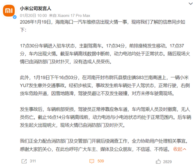 回顾事件,2026年1月19日下午,海南海口一家汽车服务中心内,一辆正在等待清洗的 小米SU7突然自燃,现场浓烟滚滚。据车主回忆,他下车仅七分钟后就接到了车辆起火的通知。同日,河南开封也发生了一起小米汽车在碰撞事故后起火的事件。