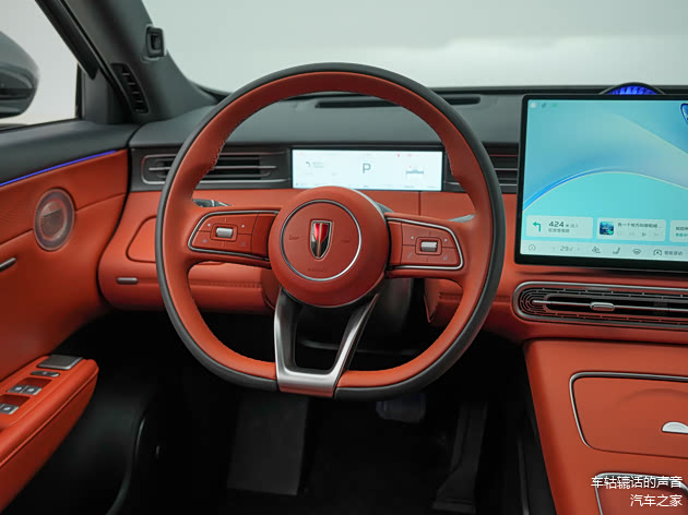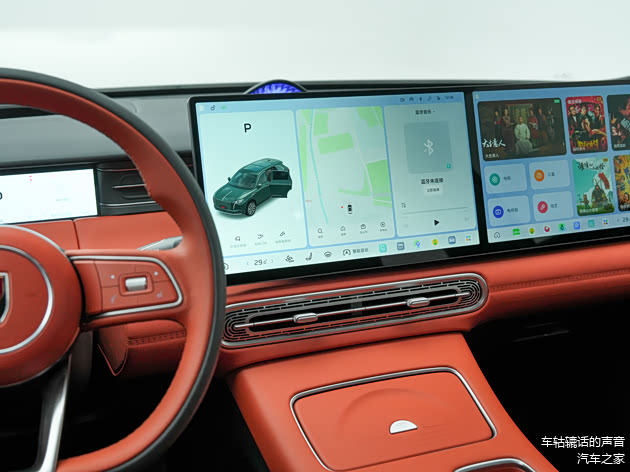 内饰部分,红旗HS6 PHEV采用了全新的设计,最引人注目的是副驾驶侧双联屏,配合液晶仪表盘和HUD抬头显示组成多屏联动。中控台面层次感丰富,采用撞色工艺覆盖。平底运动方向盘采用双色设计,也是全新造型。