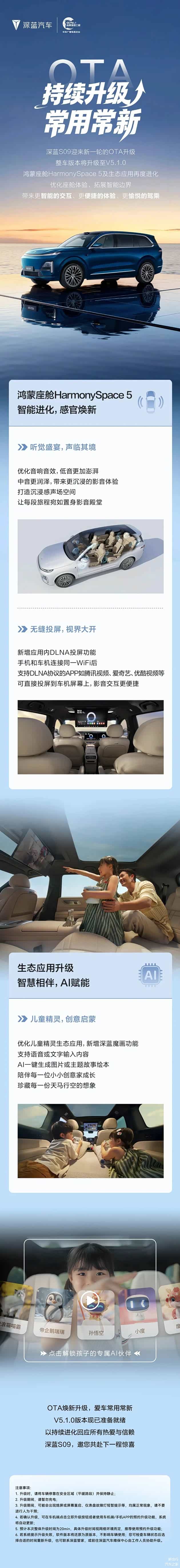 1 月 26 日,根据官方获悉,深蓝 S09 迎来新一轮 OTA,版本升级至 V5.1.0。据了解,此次升级鸿蒙座舱HarmonySpace 5 及生态应用再度进化,优化座舱体验等。
