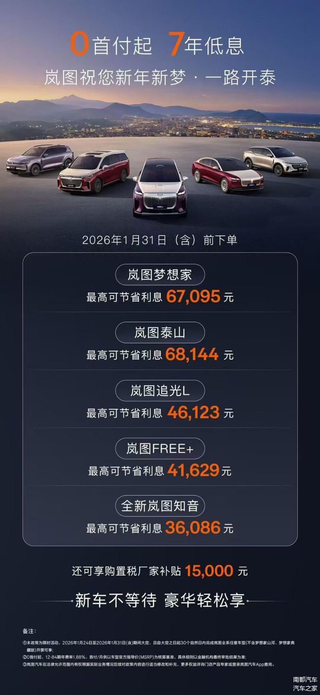 日前,岚图汽车推出“七年低息”购车方案,旗下全系车型在1月24日至1月31日期间完成大定,且30日内开票即可享受0首付、7年低息福利,12-84期年费率低至1.88%,根据车型不同可节省利息3.6万元至6.8万元。