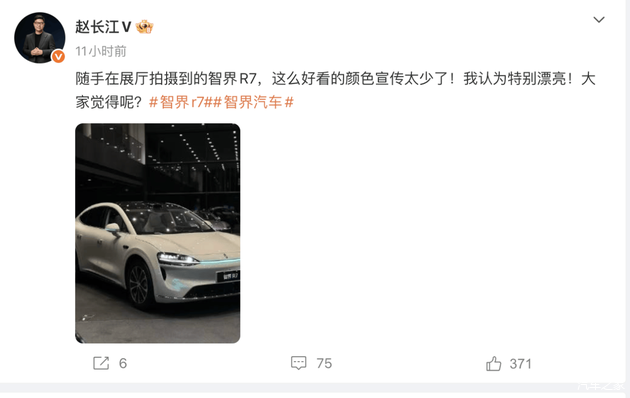 无独有偶,刚刚在微博上刷到, 智界R7执行董事赵长江对配色“宣传不足”表示感慨,称“这么好看的颜色宣传太少了”。