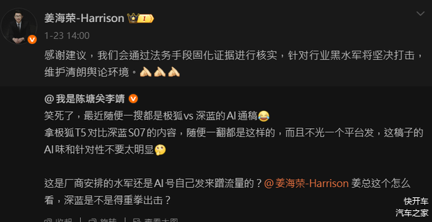 这些AI生成的文章,不仅引起了网友的注意,还引来了涉事品牌高层的注意。1月23日,深蓝汽车CEO姜海荣在社交平台转发了一则汽车博主内容,直指遭遇“黑水军”攻击:“初步判断是AI制作的,会尽快通过法务手段固化证据并核实。”