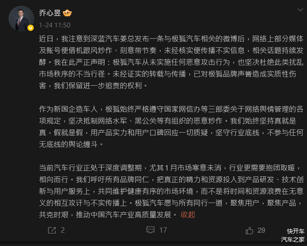在深蓝之后,极狐汽车副总经理乔心昱便在朋友圈作出正式回应:“极狐从未对深蓝实施任何恶意攻击。”他强调双方都是“新国企造车人”,呼吁行业共克时艰。