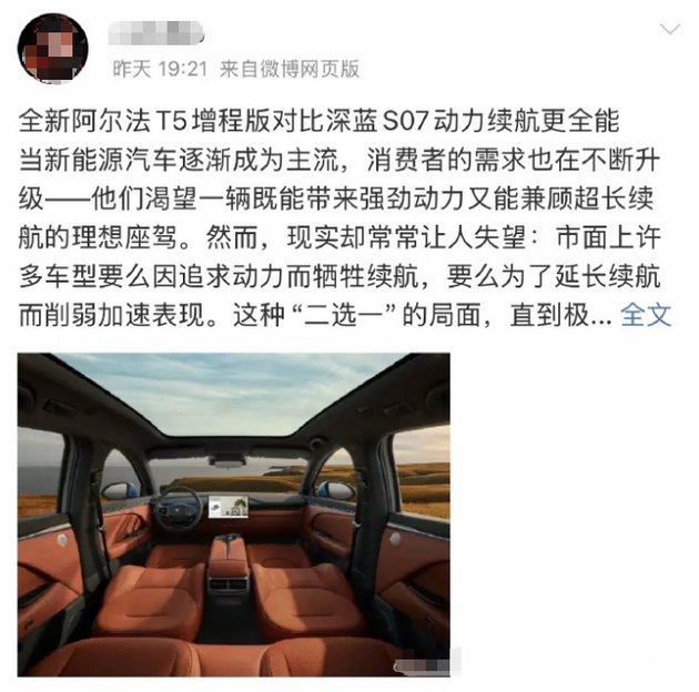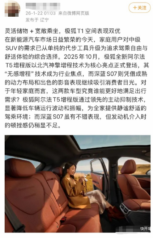 根据网友的描述来看,社交平台出现了内容高度相似的对比内容。这些内容标题结构惊人一致,如“极狐阿尔法T5对比深蓝S07,超感无感设计,谁更胜一筹?”等等。